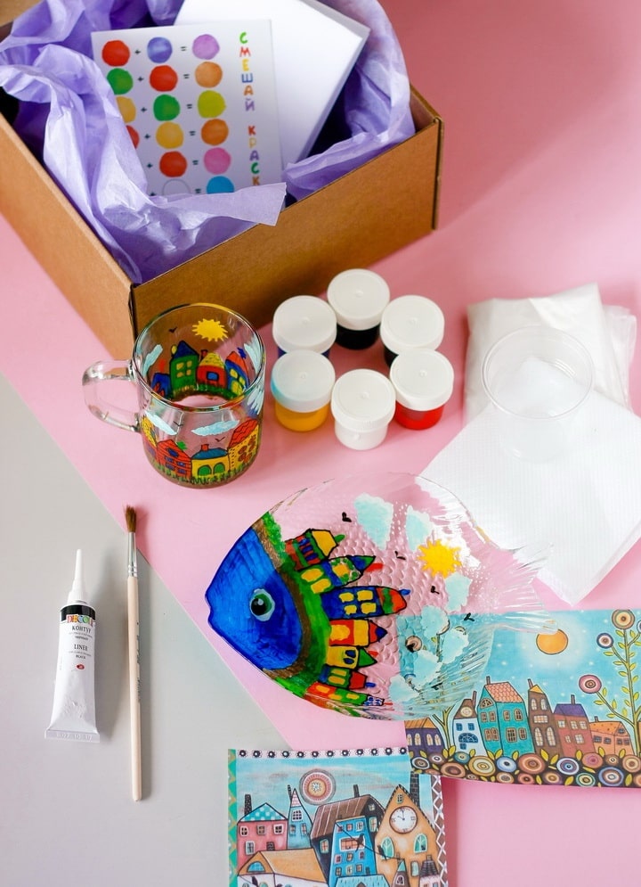- 6 баночек краски по стеклу (черная, белая, синяя, красная, желтая, зеленая, по 10 мл)